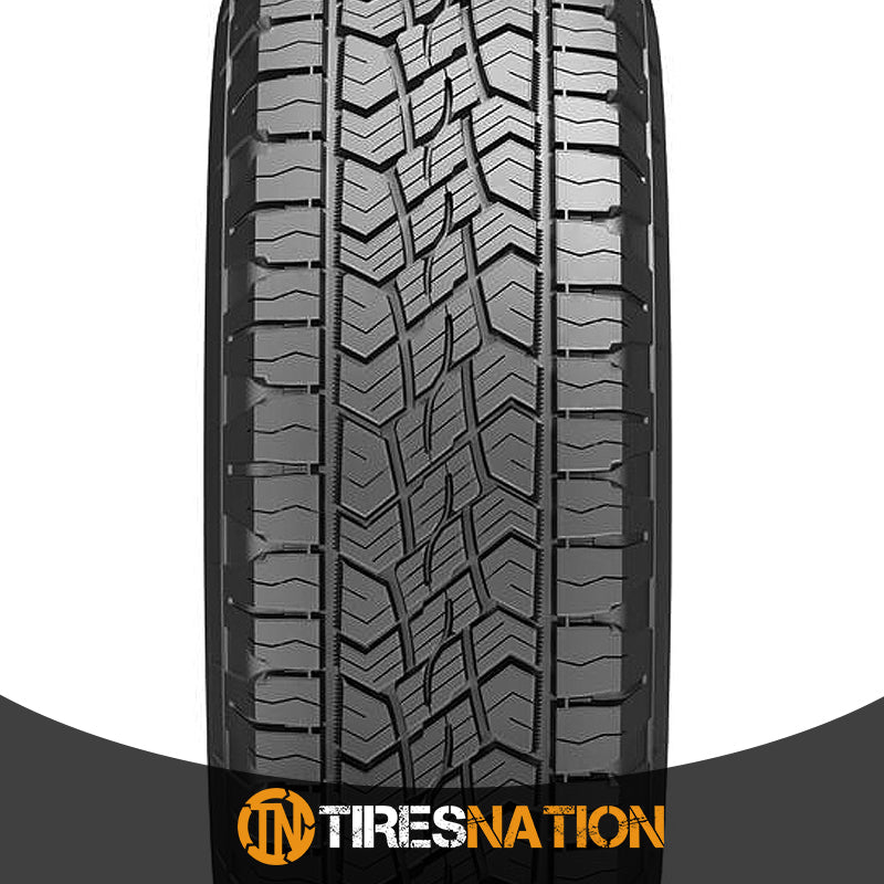 The Continental TerrainContact A/T is an off-road all season tire manufactured for SUV, crossover and light truck vehicles. Continental offers a 60,000 mile treadwear warranty with this model. The tire has great all weather traction due to the +Silane additives in the tire compound that grip the road in dry, wet and even winter conditions. The traction grooves increase the tire's grip in winter situations, like snow and ice. The full depth sipes ensure that the model will not lose its good traction with the tread wear as the sipes are not just visible on the top of the tread. The wide tread grooves actively resist hydroplaning by eliminating water from below the tire footprint. This makes the tire safer to use all year. The model has excellent off-road traction. Its mild all terrain performing capability is thanks to the tread pattern and the TractionPlus technology. They provide traction on dirt, gravel and grass roads. The model is able to perform well both on- and off-road making it perfect for driver's looking for versatility in their tires. The tire is capable of handling uneven and loose terrains as the special tread pattern grips the road surface in all conditions. During on-road driving, the model offers a quiet and comfortable drive. The ComfortRide technology reduces the road and pattern noise and the road vibrations. The tread pattern channels the soundwaves through the tread and prevents them from getting in contact with the tread elements. The tire maintains constant road contact and absorbs the shock of driving, lowering the road vibrations felt in the cabin of the vehicle. This makes the driving experience more enjoyable. A longer tread life is guaranteed with the stabilized tread blocks. The +Silane compound and the tread blocks prevent irregular wear across the tread area and increase the tread life. As the tire is not allowed to adopt an uneven tread pattern, it is usable for a longer period of time. The longer tread life is further improved with the reduced rolling resistance. The compound reduces the rolling resistance which, in turn, decreases the fuel consumption and CO2 emissions of the vehicle. The vehicle does not need as much energy to keep the tires in motion, which makes it fuel and cost efficient. The TerrainContact A/T's internal structure features twin, high-tensile steel belts spirally wound with polyamide. This structure improves the tire's durability and prevents it from deforming. As the tire's shape is maintained the tire is capable of performing to its highest capability.