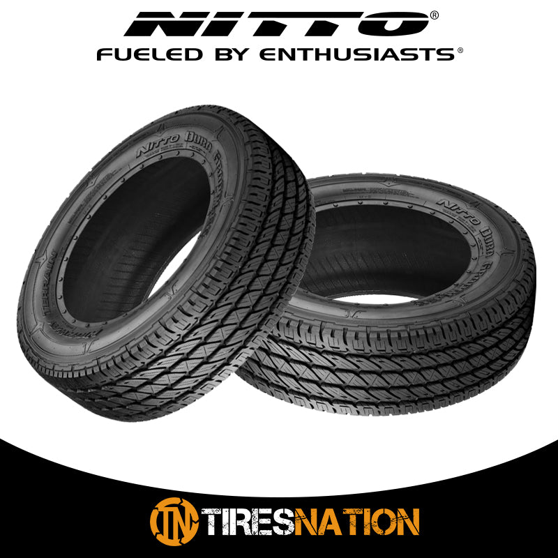 The Nitto Dura Grappler tire is a highway all-terrain tire that has long-wear life, a quiet and comfortable ride but with plenty of traction for the occasional off-road adventure. It has a heavy duty carcass for extra loads and commercial applications. It is commonly used on SUVs and pick up trucks that rarely go off-road. All the LT sizes have 10 ply sidewalls ("E" load range) with a durable tread rubber molded into a 4-rib design. The p-metric sizes for SUVs has a different rubber and a slightly quieter 5-rib tread design. With the Dura Grappler tire, like several other Nitto tires, you get two styling options with every tire thanks to the dual sidewall design - one side has plain side-lugs and the other side has attention grabbing "shark fin" shaped lugs.